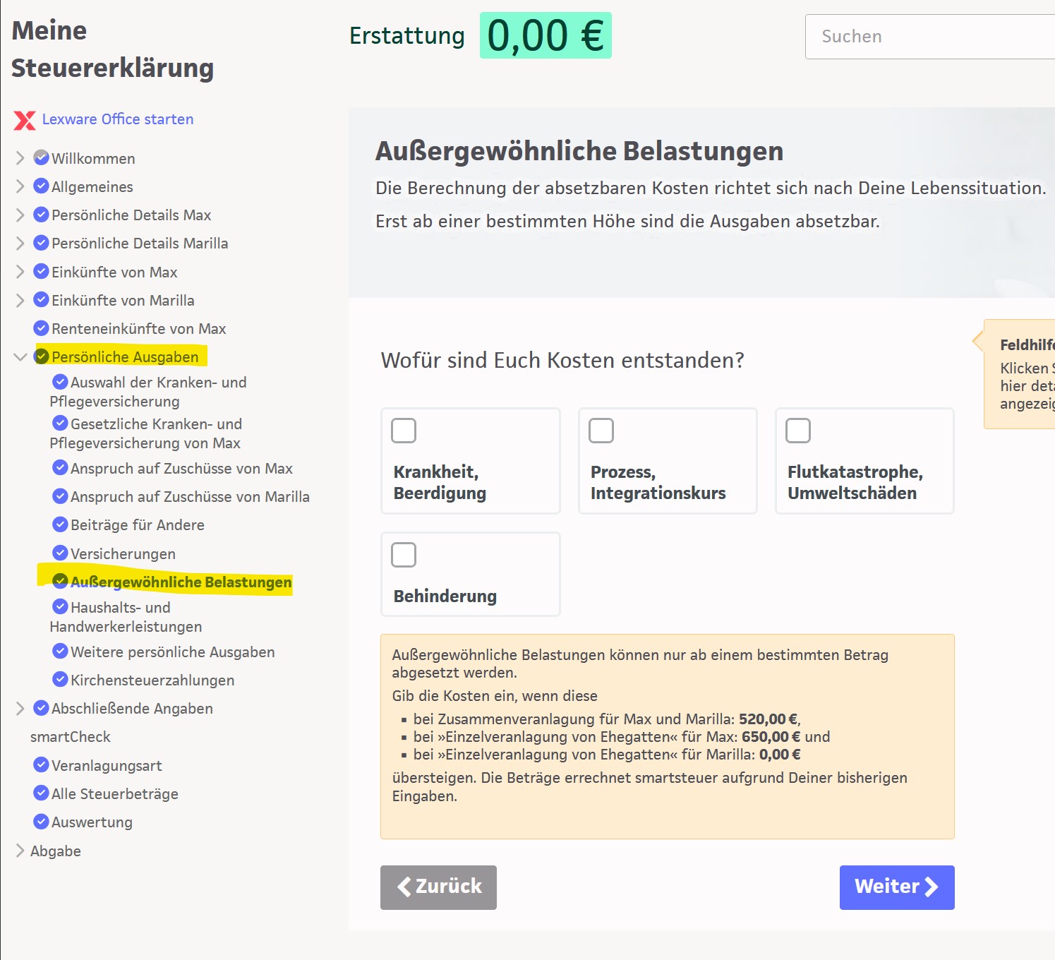 Egal ob Fahrten zum Arzt, medizinisch notwendige Behandlungen oder Kosten für Medikamente. Diese Kosten kannst Du in „Persönliche Ausgaben“ an der folgende Stelle eintragen: