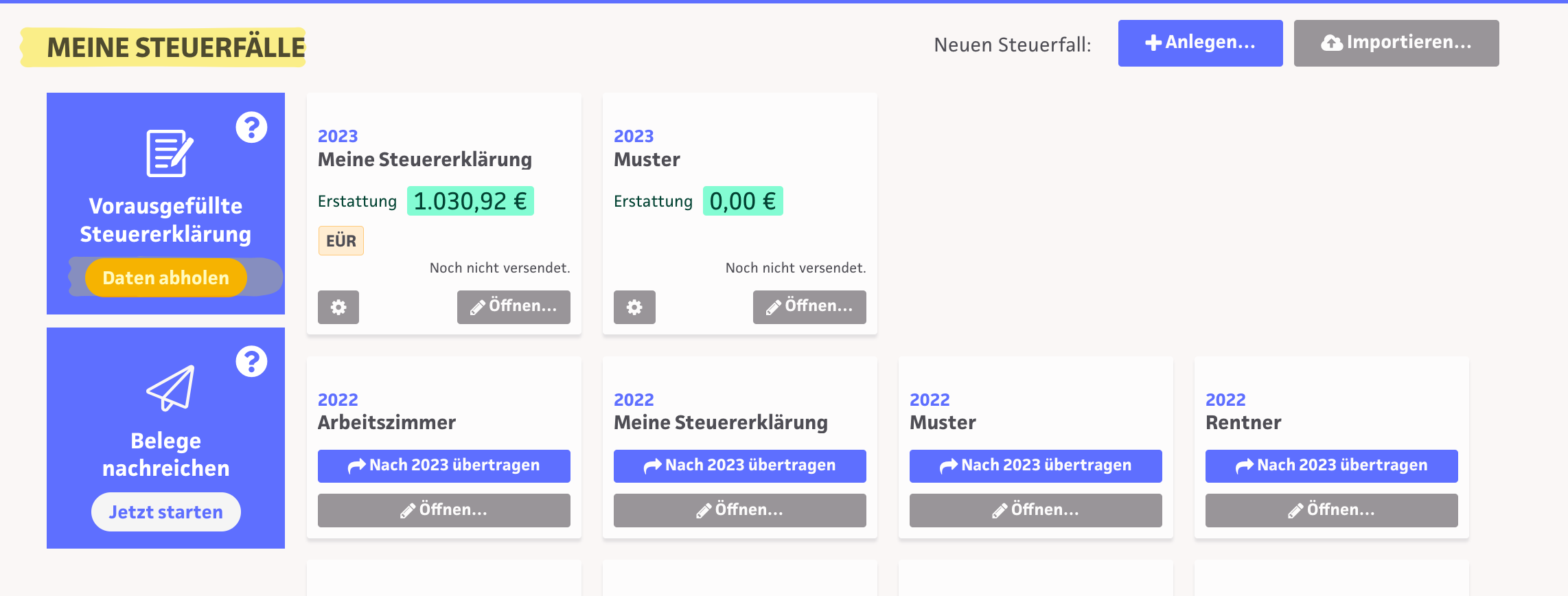 - Logge Dich unter smartsteuer.de in Dein Benutzerkonto, ein. Gehe auf die Übersicht aller Steuerfälle.