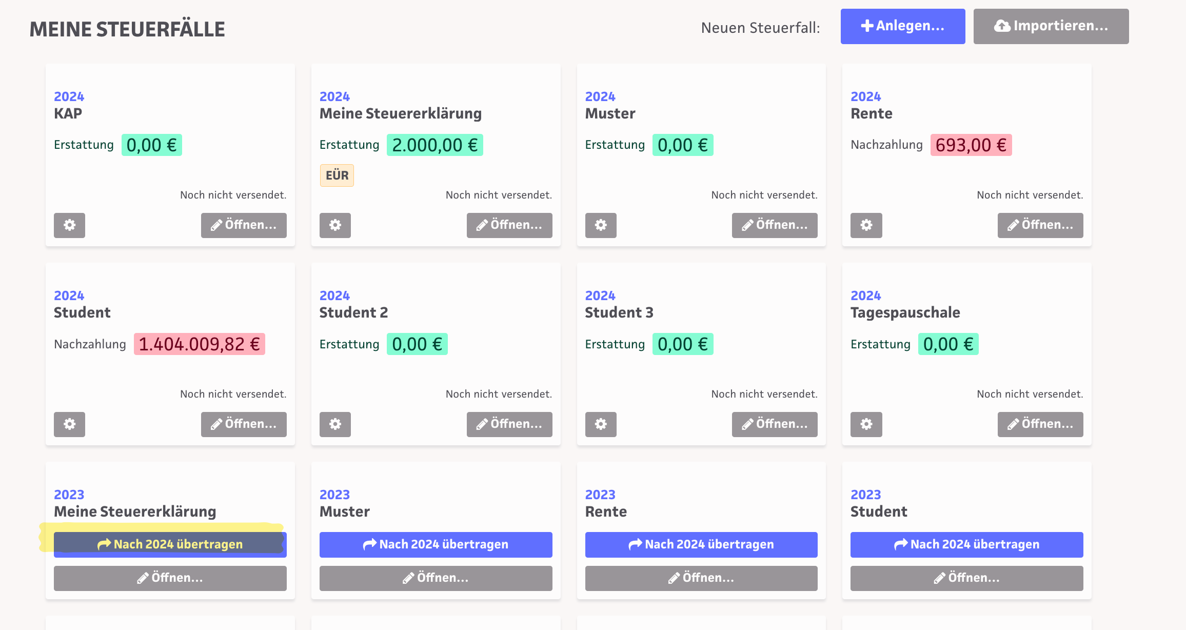 - Gehe ins neue Steuerjahr und übertrage mit einem Klick auf den Button „Nach 20xx übertragen“ die Daten aus Deiner „alten“ Steuererklärung des Vorjahrs. Den Button findest Du unterhalb des „alten“ Steuerfalls.