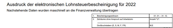 Im Jahr 2022 waren die Arbeitgeber in der Regel verpflichtet, ihren Arbeitnehmern eine Energiepreispauschale auszuzahlen. Wurde diese vom Arbeitgeber ausgezahlt, wird in der Lohnsteuerbescheinigung der Großbuchstabe E eingetragen.