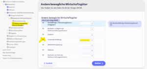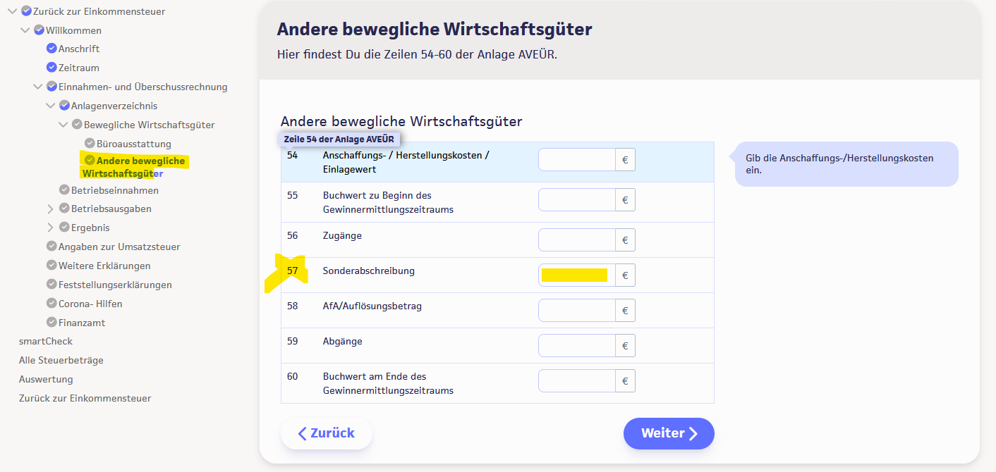 3) Unter Anlagenverzeichnis – andere bewegliche WG – kannst Du ggf. eine Sonderabschreibung gem. §7g Abs 5 und 6 EStG eintragen.