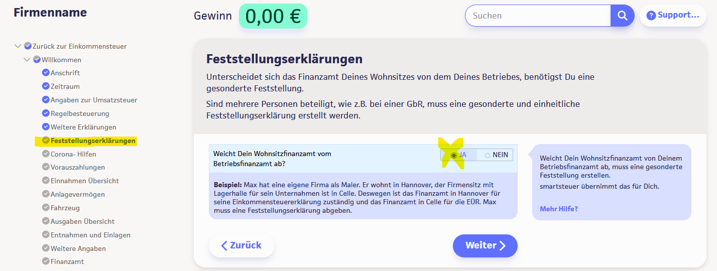 In der EÜR kannst Du auf der Seite »Feststellungserklärung« den Haken an der entsprechenden Stelle setzen und smartsteuer füllt die Formulare für Dich aus.