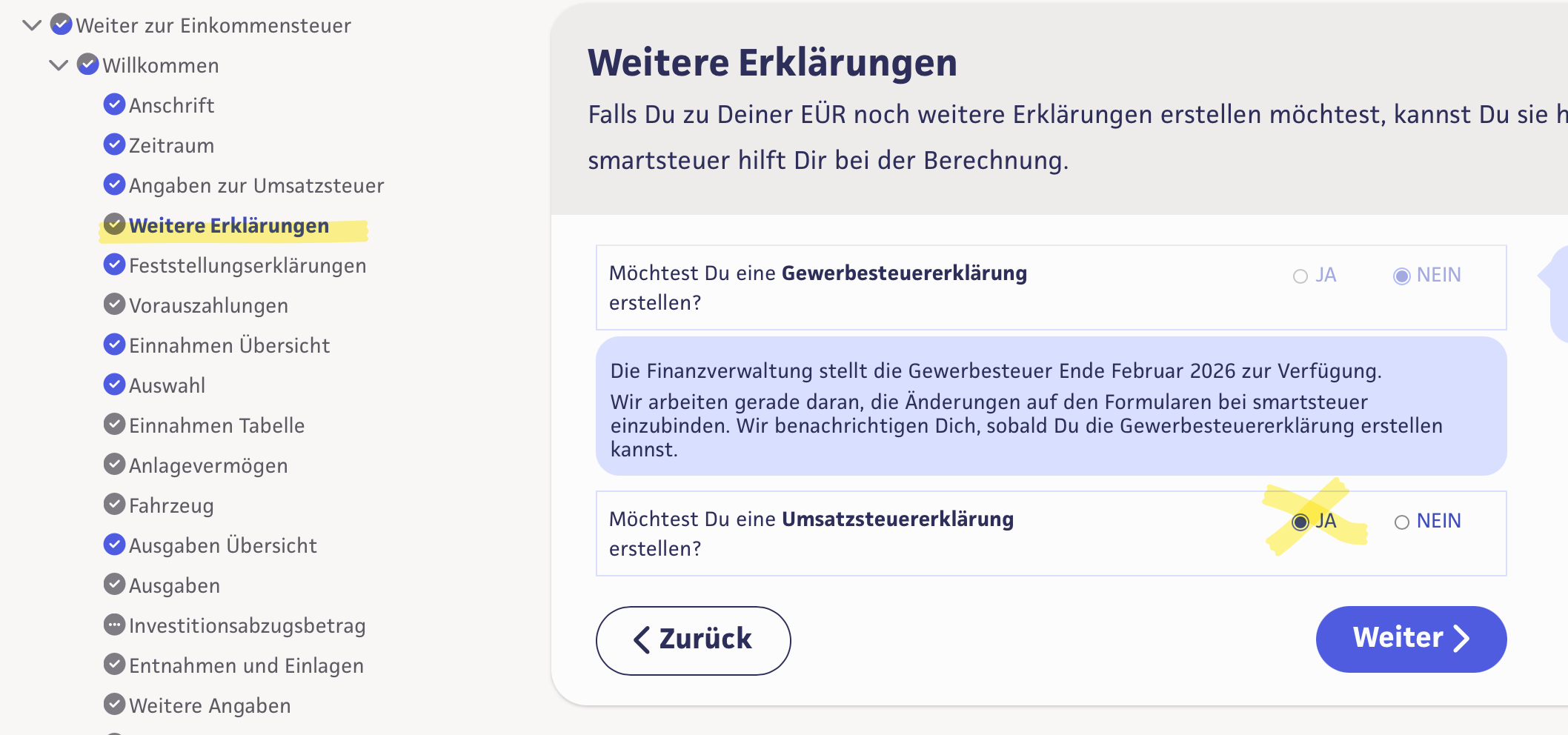 In der EÜR unter dem Punkt »weitere Erklärungen« kannst Du den Haken zur Erstellung der Umsatzsteuererklärung setzen: