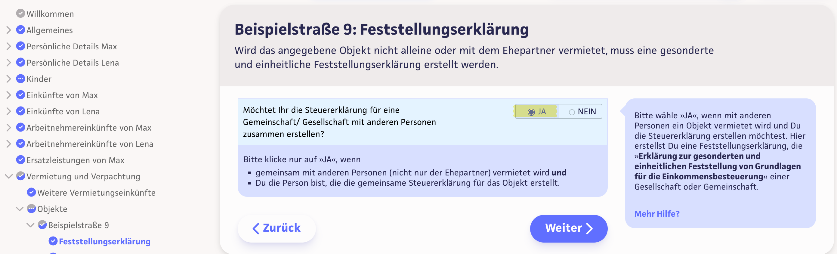 Beantworte hierzu auf der Seite »Weitere Vermietungseinkünfte« die Frage nach der »Erstellung einer Feststellungserklärung« mit »Ja«.