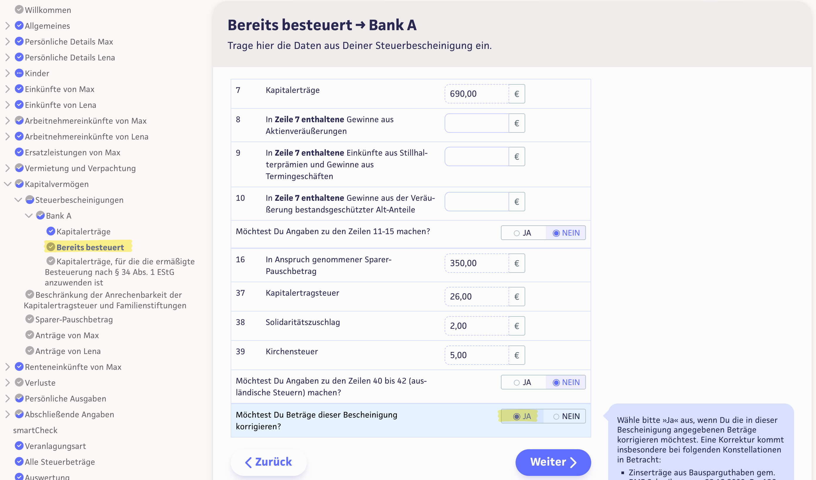 Bitte erfasse diese Kosten, indem Du sie in den korrigierten Beträgen der Bescheinigung berücksichtigst. Diese Angabe findest Du unter »Kapitalerträge aus dem Inland« ganz unten auf der Seite.