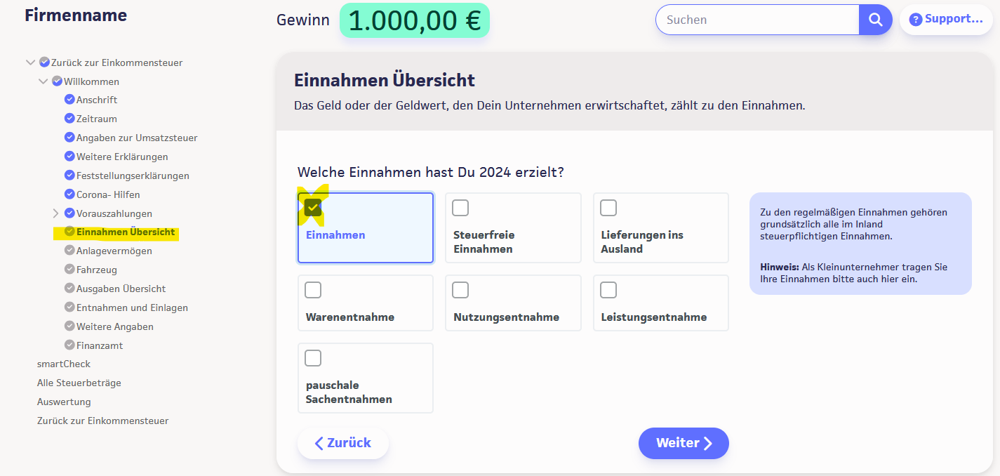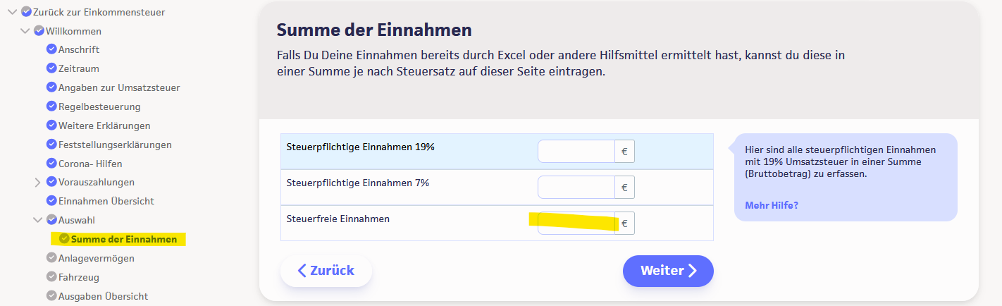 Hier kannst Du die Summe der Einnahmen dieser Art erfassen: