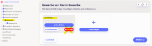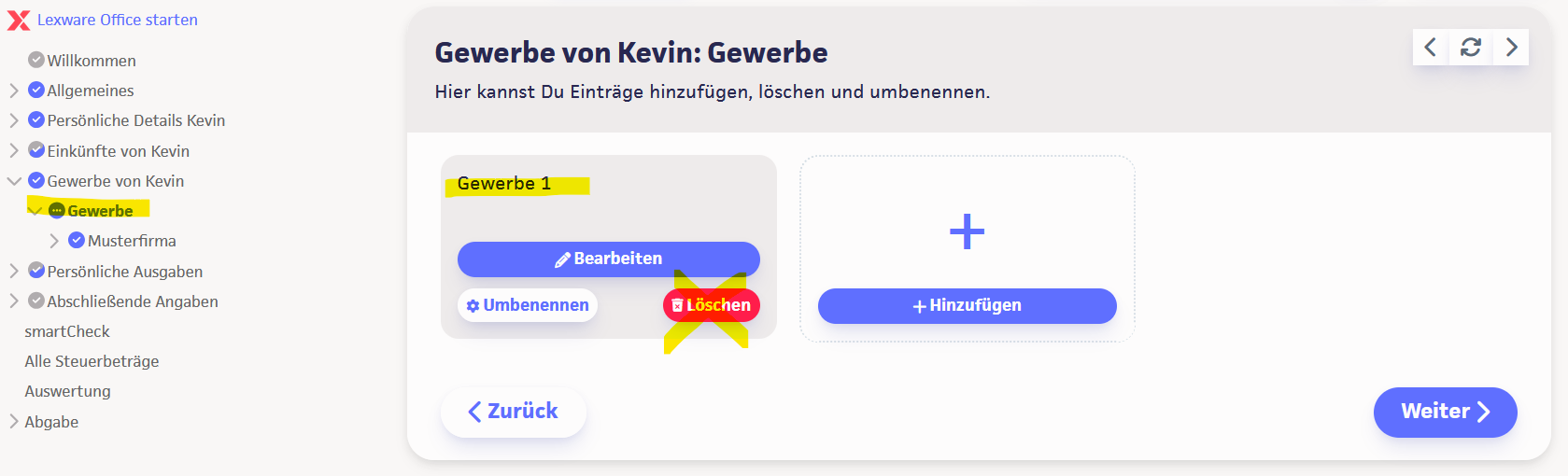 Lösche dann im Bereich “Gewerbebetrieb“ oder “Selbstständige Arbeite“ die angelegte Tätigkeit, wie im Bild markiert:
