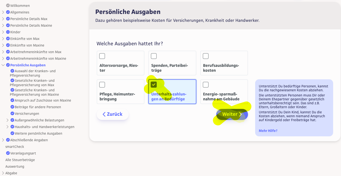 Erhält niemand mehr Kindergeld für das Kind, kannst Du den Kindesunterhalt unter dem Punkt »Persönliche Ausgaben« und »Unterhaltszahlungen an Bedürftige« erfassen.