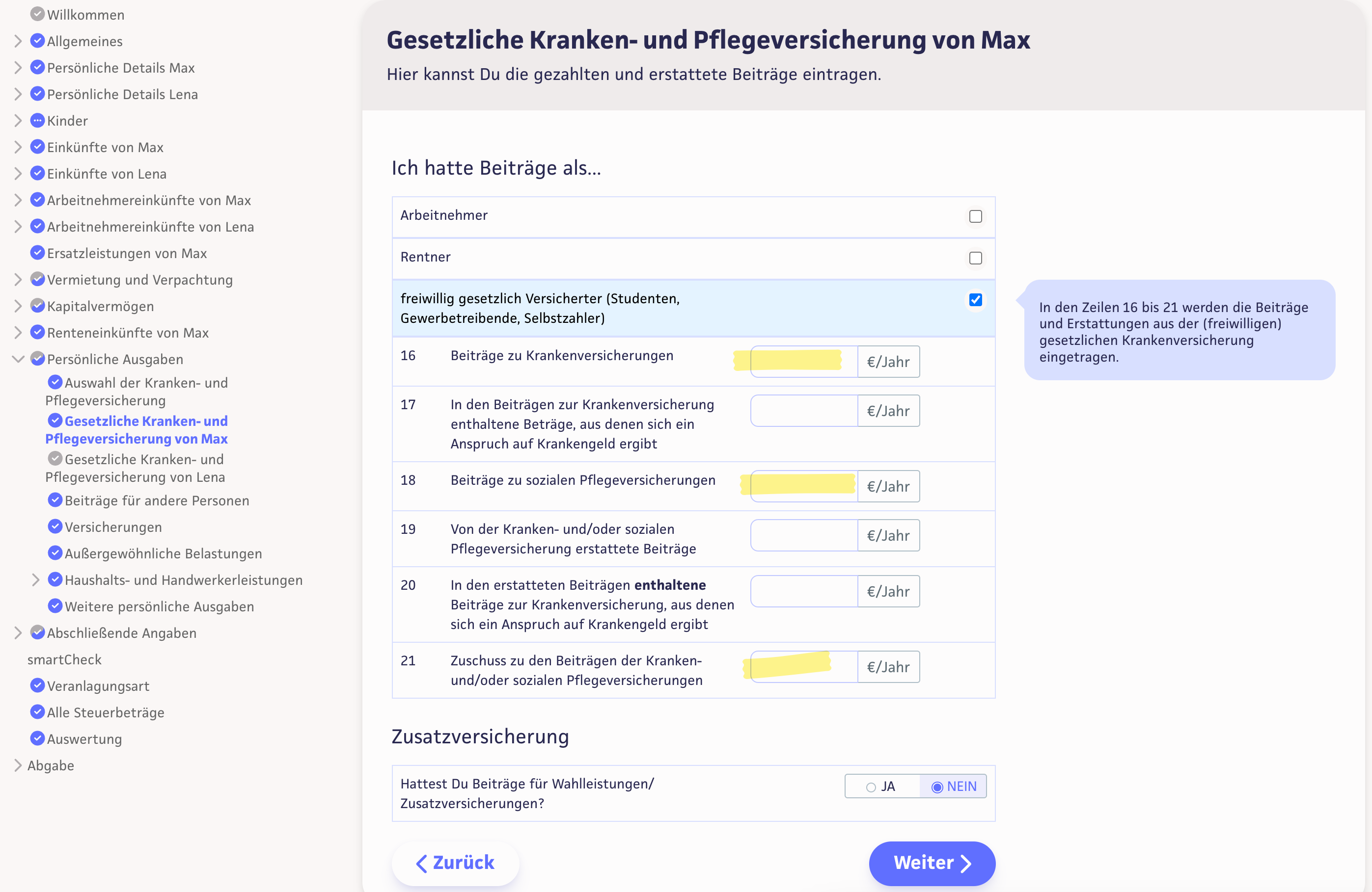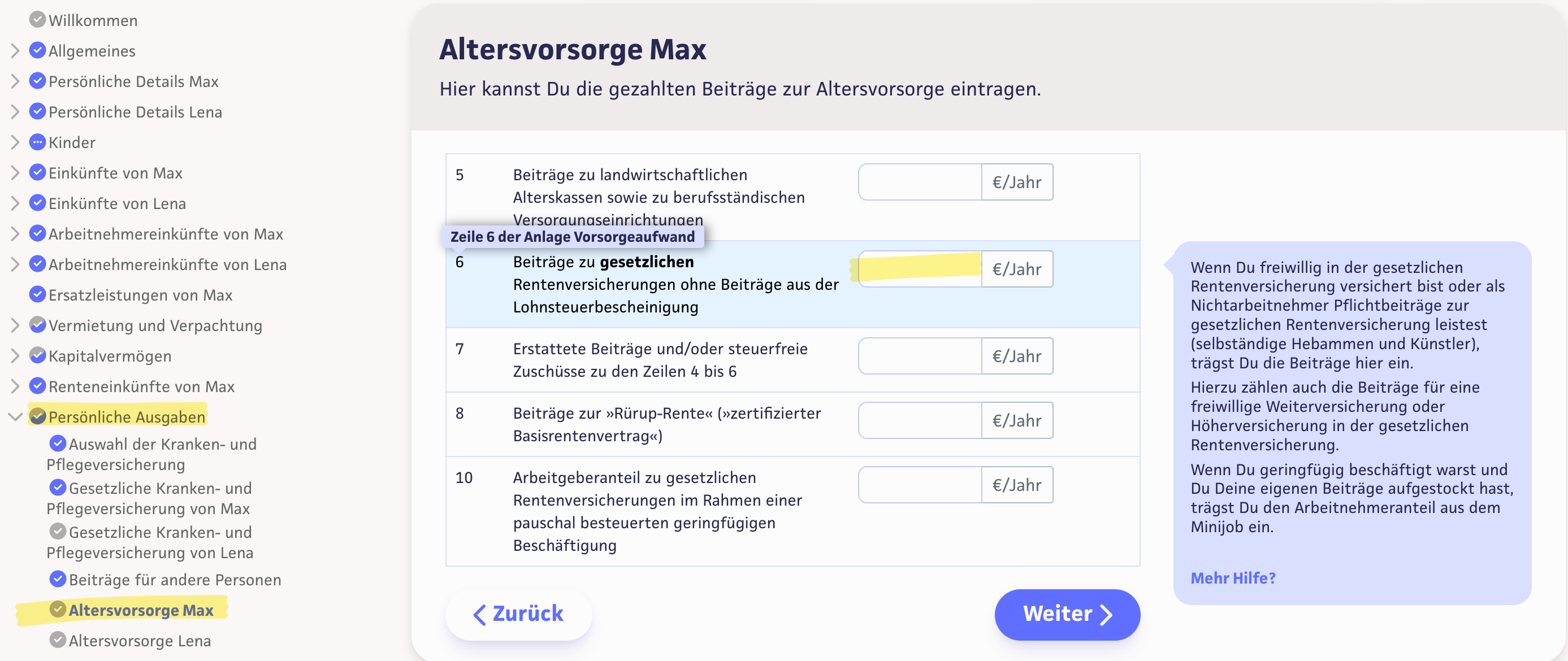 Die Summe der Beiträge für die Rentenversicherung erfasst Du unter »Persönliche Ausgaben« > »Beiträge zur Altersvorsorge« in der Zeile 6.