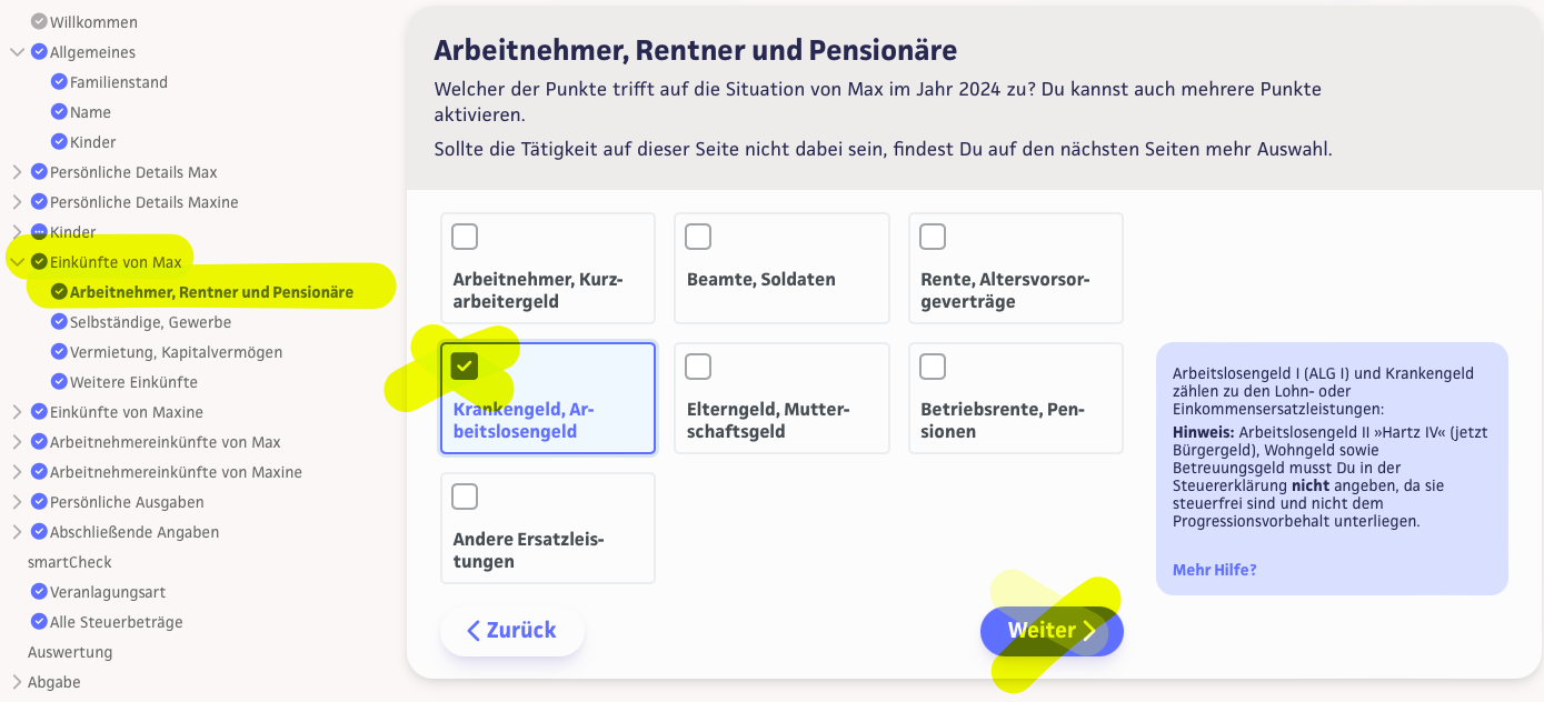 Aktiviere bitte im Bereich »Einkünfte« unter »Einkünfte von__« auf der Seite »Arbeitnehmer, Rentner und Pensionär« den Haken bei: »Krankengeld, Arbeitslosengeld«.