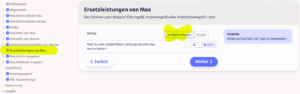 Im nächsten Schritt wird die Seite »Einkommensersatzleistungen für __« angelegt. Diese findest Du im Navigationsbaum(linker Bildschirmrand). Dort kannst Du die Beträge in einer Tabelle eintragen.