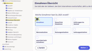 In der EÜR findest Du nach der Eingabe von allgemeinen Daten die Seite »Einnahmen Übersicht«,
