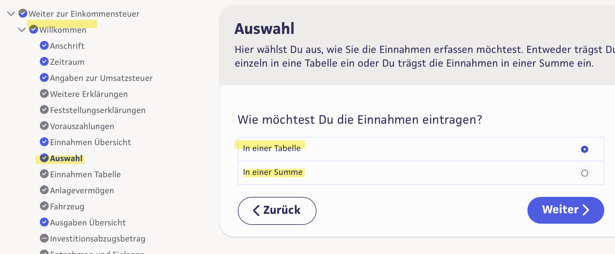 Auf der nächsten Seite kannst Du auswählen, wie Du die Einnahmen erfassen möchtest.