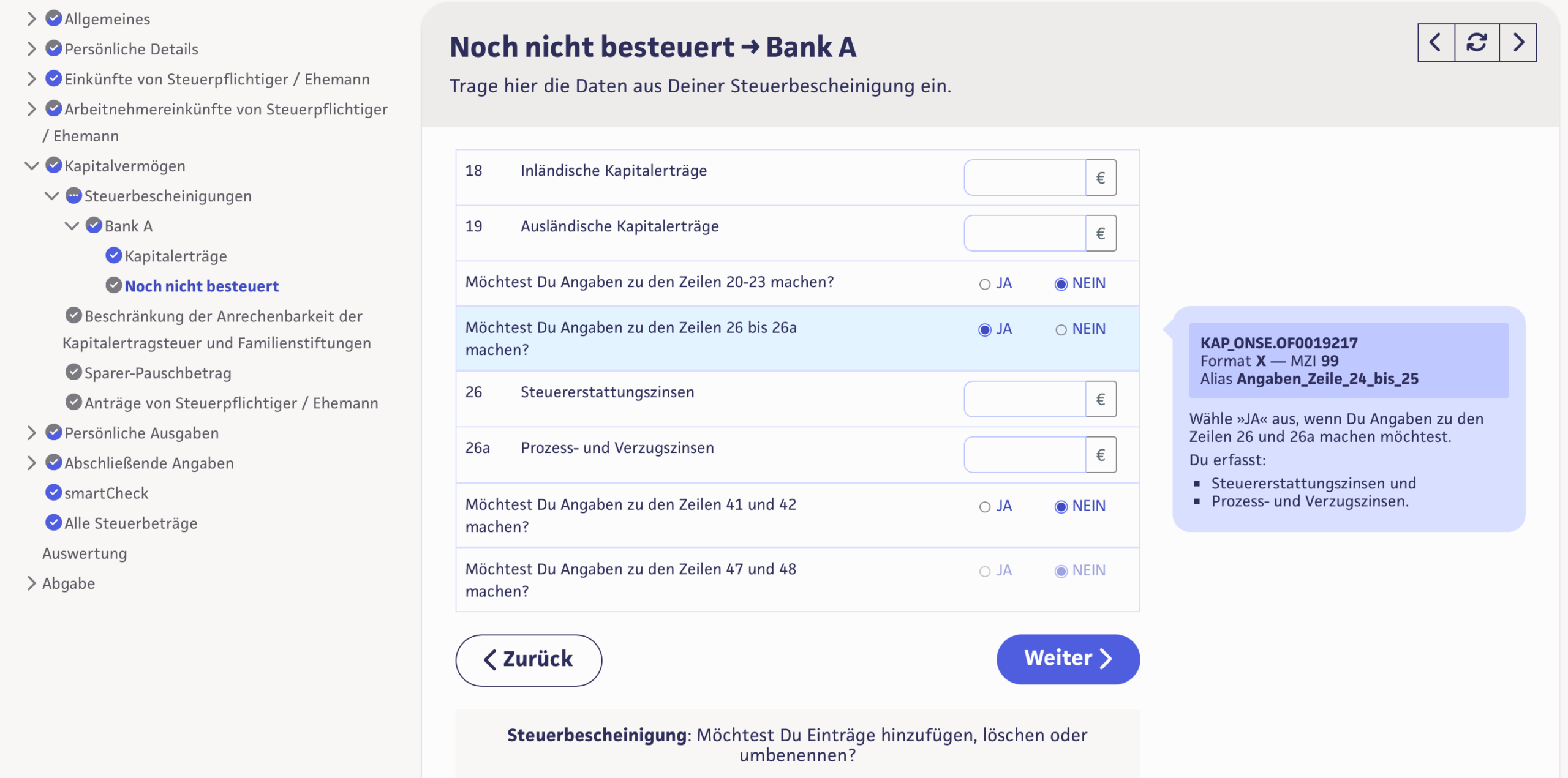 Auf der nächsten Seite findest Du die Zeile 26, hier kannst Du die erhaltenen Zinsen eintragen: