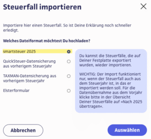 - Im neuen Fenster, welches sich öffnet, wähle bitte den Punkt »smartsteuer 2025« aus und klicke anschließend auf »Auswählen«: