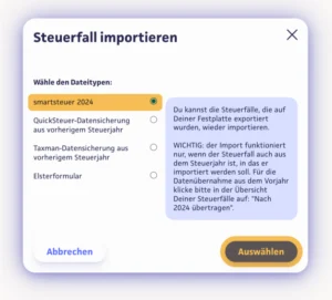 - Anschließend importierst Du den eben gespeicherten Fall bitte wieder über die Import-Funktion auf der Seite »Meine Steuerfälle«: