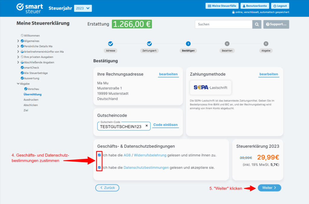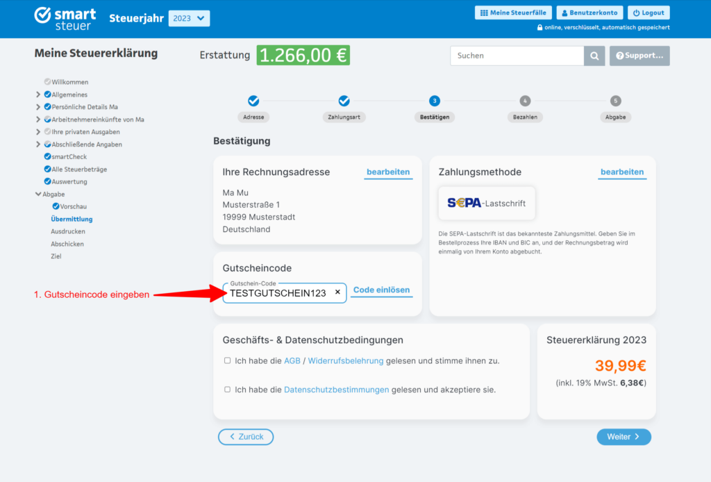 Deinen smartsteuer Gutschein kannst Du am Ende des Interviews im Bezahlvorgang einlösen. Den Bezahlvorgang findest Du unter dem Menüpunkt „Abgabe“ > „Übermittlung“ (links unten).