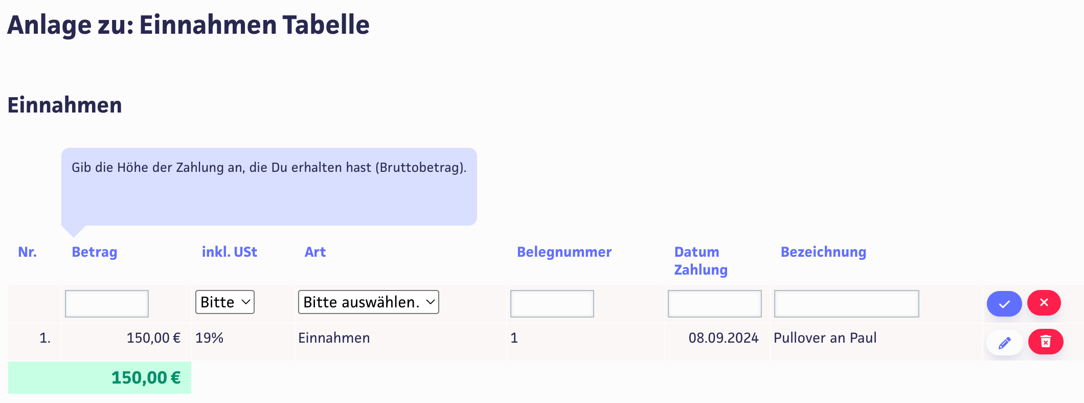 Die ursprüngliche Rechnung trägt Sophie in der Einnahmen-Tabelle ein: