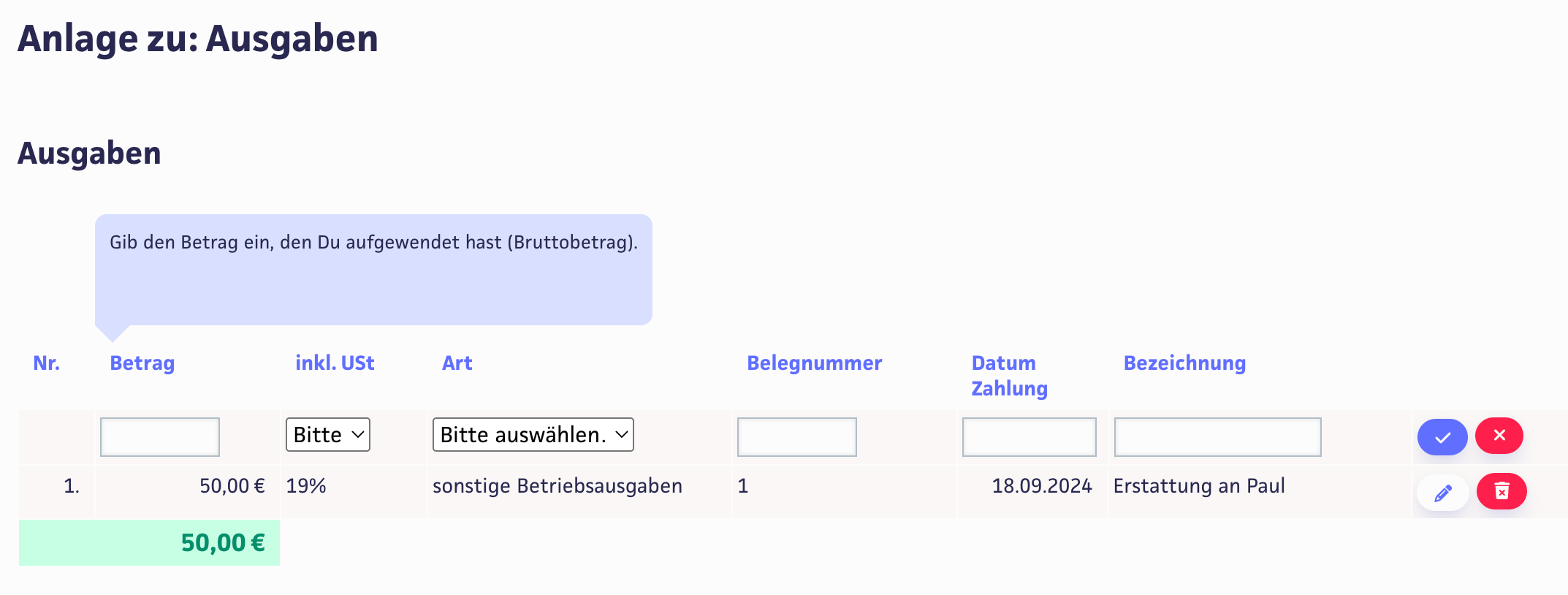 Die Stornorechnung trägt Sophie im Bereich Ausgaben ein, da sie den Betrag an Paul erstattet hat: