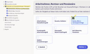 Leistungen aus einem Altersvorsorgevertrag kannst Du eintragen, indem Du den folgenden Haken im Bereich Rente setzt: