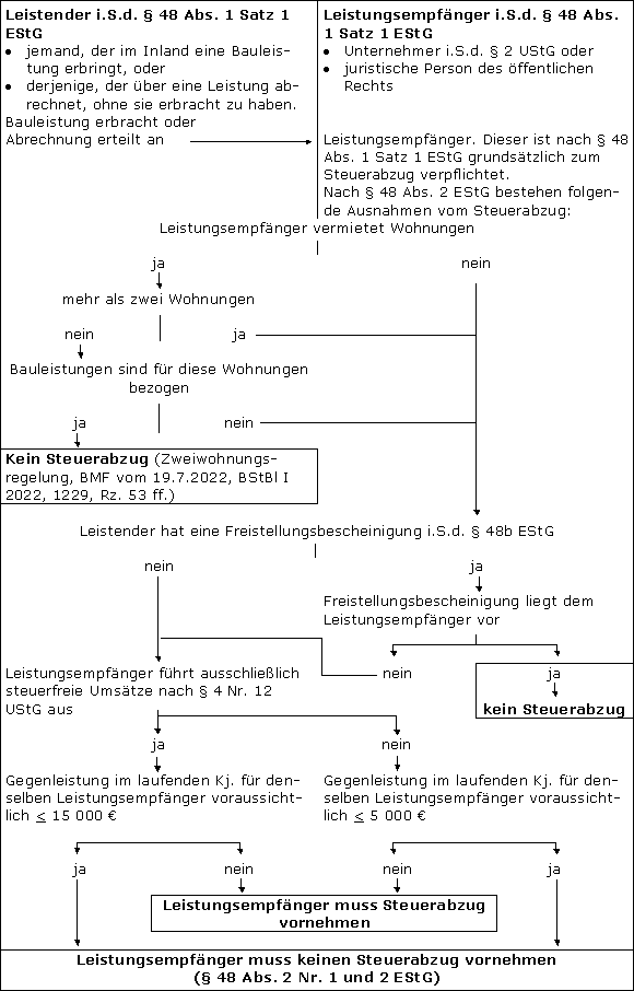 Für Bauleistungen (→ Bauleistungen in der Umsatzsteuer), die nach dem 31.12.2001 erbracht werden (§ 52 Abs. 56 EStG), ist nach § 48 EStG ein Steuerabzug von 15 % der Gegenleistung vorzunehmen (Gesetz zur Eindämmung illegaler Betätigung im Baugewerbe vom 30.8.2001 BGBl I 2001, 2267, BStBl I 2001, 602). Mit dem Gesetz wurde zur Sicherung von Steueransprüchen und zur Vermeidung von Schwarzarbeit im Baugewerbe ein Steuerabzug bei der im Inland stattfindenden Ausführung von Bauleistungen eingeführt. Die gesetzlichen Regelungen hierzu finden sich in den §§ 48 bis 48d EStG. Zum Steuerabzug von Vergütungen für im Inland erbrachte Bauleistungen (§§ 48 ff. ESt) nimmt das BMF mit Schreiben vom 19.7.2022, BStBl I 2022, 1229 Stellung und überarbeitet das bis dahin gültige Schreiben vom 27.12.2002 (BStBl I 2002, 1399).