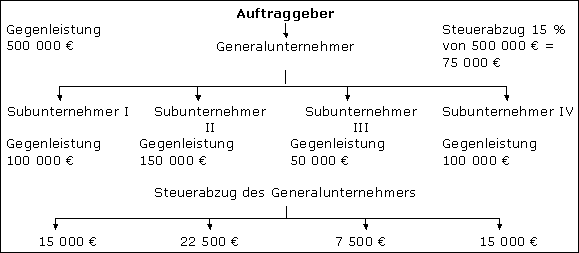 Bei einem Brutto-Rechnungsbetrag von 119 000 € beträgt der Steuerabzug von 15 % = 17 850 €, sodass der Leistende 101 150 € (= 85 % von 119 000 €) erhält.