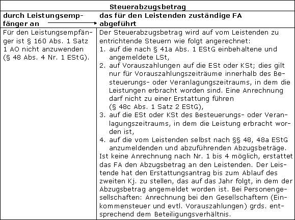 Die Bauabzugsteuer ist vergleichbar mit der Einbehaltung der Lohn- oder Kapitalertragsteuer. Die Bauabzugsteuer stellt eine Steuervorauszahlung dar, die der Leistende im Anrechnungsverfahren nach § 48c Abs. 1 EStG oder durch ein Erstattungsverfahren zurückfordern kann.