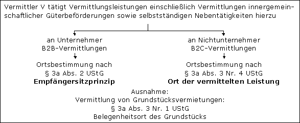 Zum Ort der Vermittlungsleistung s.u. sowie Abschn. 3a.7 UStAE. Weitere Erläuterungen zu den Ortsvorschriften bei der Vermittlung von sonstigen Leistungen s. → Sonstige Leistung.