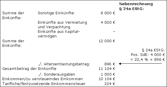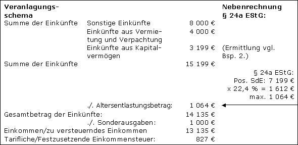 Es ergibt sich zur Berechnung des Altersentlastungsbetrages das gleiche Ergebnis wie im Ausgangsbeispiel. Gem. § 2 Abs. 5b EStG sind, soweit Rechtsnormen des EStG an die Begriffe Einkünfte, Summe der Einkünfte, Gesamtbetrag der Einkünfte anknüpfen, Kapitalerträge nach § 32d Abs. 1 EStG, die von dem gesonderten Steuertarif erfasst werden, nicht einzubeziehen. Auf diese Erträge ist die Vorschrift des § 24a EStG, soweit sie an den Begriff der Einkünfte anknüpft, gem. § 2 Abs. 5b EStG nicht anzuwenden.