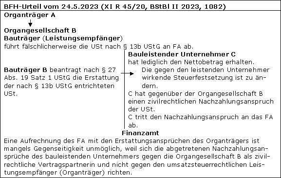 Nach dem BFH-Urteil vom 24.5.2023 (XI R 45/20, BStBl II 2023, 1082) ist umsatzsteuerrechtlicher Leistungsempfänger i.S.d. § 27 Abs. 19 Satz 1 UStG bei bestehender Organschaft auch dann der Organträger, wenn zivilrechtlich die Organgesellschaft Vertragspartnerin des bauleistenden Unternehmers ist. Der zivilrechtliche Nachzahlungsanspruch des bauleistenden Unternehmers auf Zahlung der gesetzlich entstandenen USt richtet sich trotz Organschaft nicht gegen den Organträger, sondern gegen die Organgesellschaft als Leistungsempfänger (BFH XI R 45/20, Rz. 34). Umsatzsteuerrechtlich bleibt aber der Organträger Leistungsempfänger, sodass auch diesem ein Erstattungsanspruch zusteht.