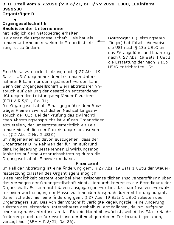 Mit Urteil vom 6.7.2023 (V R 5/21, BFH/NV 2023, 1380, LEXinform 0953588) hat der BFH die Aufrechnung in Bauträgerfällen entschieden, in denen die Organgesellschaft als bauleistender Unternehmer tätig war. Im Urteilsfall war zu entscheiden, ob die Organgesellschaft den zivilrechtlichen Nachzahlungsanspruch der USt gegen den Bauträger an das FA abtreten kann, wenn über das Vermögen der Organgesellschaft das Insolvenzverfahren eröffnet worden ist.