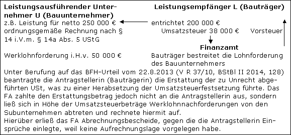 Im Urteilsfall hat ein Einzelunternehmer seine Bauleistungen an die Q-KG im Streitjahr 2009 und damit vor dem 15.2.2014 erbracht. Beide sind bei Vertragsabschluss davon ausgegangen, dass die Q-KG als Leistungsempfängerin die Steuer nach § 13b UStG schuldete. Diese Annahme hat sich aufgrund des BFH-Urteils vom 22.8.2013 (V R 37/10, BStBl II 2014, 128) als unrichtig herausgestellt. Nach den bindenden Feststellungen des FG hat die Q-KG die Leistungen des Einzelunternehmers (Klägers) ihrerseits nicht zur Erbringung einer Bauleistung verwandt. Die Q-KG hat schließlich die Erstattung der Steuer gefordert, die sie vorher in der Annahme entrichtet hatte, Steuerschuldnerin zu sein.