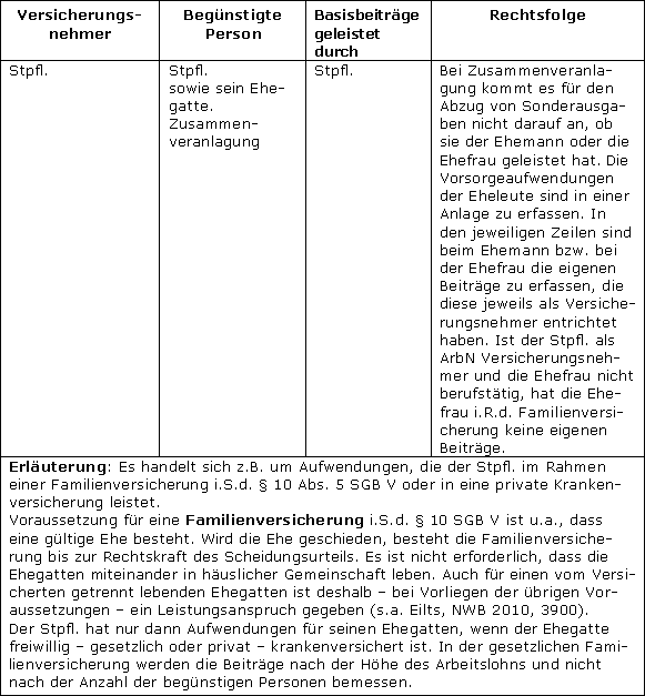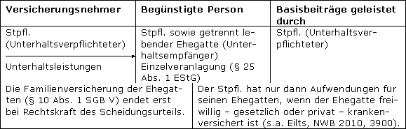Ist in der Basis-Kranken- oder Pflegepflichtversicherung des Stpfl. auch ein geschiedener oder dauernd getrennt lebender unbeschränkt einkommensteuerpflichtiger Ehegatte mit abgesichert, sieht das Gesetz eine Sonderregelung vor (§ 10 Abs. 1 Nr. 3 Satz 3 EStG).