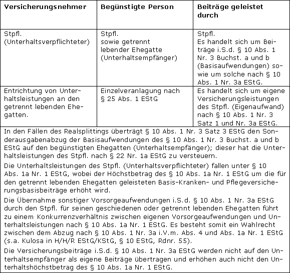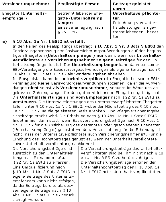 Die Basis-Versicherungsleistungen des Stpfl. werden zu eigenen Basis-Versicherungsbeiträgen des getrennt lebenden Ehegatten (Unterhaltsempfänger) nach § 10 Abs. 1 Nr. 3 Satz 3 EStG. Gleichzeitig sind die Basis-Versicherungsbeiträge als Einnahmen i.S.d. § 22 Nr. 1a EStG zu erfassen. |