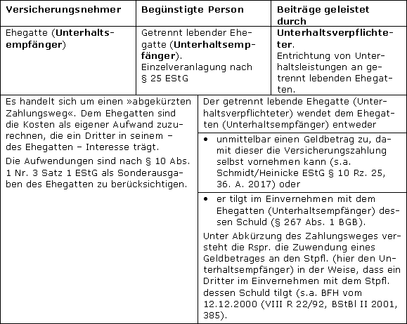 Nicht unter den Anwendungsbereich des § 10 Abs. 1 Nr. 3 Satz 3 EStG fallen hingegen Zahlungen der steuerpflichtigen Person unmittelbar an den geschiedenen oder dauernd getrennt lebenden unbeschränkt einkommensteuerpflichtige Ehegatten oder im Rahmen eines abgekürzten Zahlungsweges an eine Versicherung für eine von dem geschiedenen oder dauernd getrennt lebenden unbeschränkt einkommensteuerpflichtigen Ehegatten abgeschlossene Versicherung i.S.d. § 10 Abs. 1 Nr. 3 Satz 1 Buchst. a oder Buchst. b EStG. In diesem Fall handelt es sich um Beiträge des geschiedenen oder dauernd getrennt lebenden unbeschränkt einkommensteuerpflichtigen Ehegatten, die dieser im Rahmen seiner eigenen ESt-Erklärung geltend machen kann.