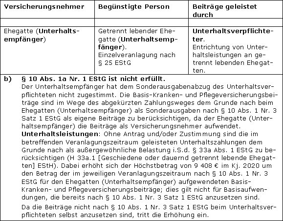 Eigene Basis-Kranken- und Pflegeversicherungsbeiträge des Stpfl., die dieser für seinen dauernd getrennt lebenden oder geschiedenen Ehegatten leistet, werden nach § 10 Abs. 1 Nr. 3 Satz 3 EStG als eigene Beiträge des Unterhaltsempfängers behandelt. Dies gilt allerdings nur in den Fällen des § 10 Abs. 1a Nr. 1 EStG.