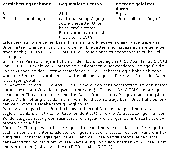 Mit dieser Sonderregelung wird sichergestellt, dass die Aufwendungen für eine Kranken- und Pflege-Pflichtversicherung auf sozialhilferechtlich gewährleistetem Leistungsniveau einmal bei der Ermittlung des zu versteuernden Einkommens berücksichtigt werden. Die von der steuerpflichtigen Person geleisteten Beiträge werden in diesem Fall als eigene Beiträge des geschiedenen oder dauernd getrennt lebenden unbeschränkt einkommensteuerpflichtigen Ehegatten behandelt. Eine Doppelberücksichtigung ist ausgeschlossen, da § 10 Abs. 1 Nr. 3 Satz 3 EStG nur zur Anwendung kommt, wenn der geschiedene oder dauernd getrennt lebende unbeschränkt einkommensteuerpflichtige Ehegatte zuvor einer Versteuerung der Unterhaltsleistungen nach § 22 Nr. 1a EStG i.R.d. Realsplittings zugestimmt hat. Andernfalls liegen bei ihm steuerfreie Einnahmen vor und ein Abzug wäre nach § 10 Abs. 2 Nr. 1 EStG nicht möglich.