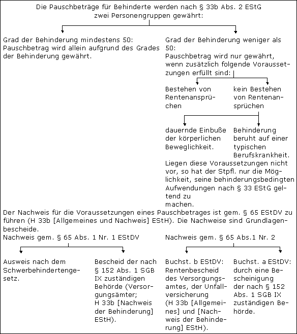 Die Vorschrift des § 33b EStG regelt drei Pauschbeträge: Den Behinderten-Pauschbetrag, Hinterbliebenen-Pauschbetrag und den Pflege-Pauschbetrag. Diese können nebeneinander zum Ansatz kommen. Der Behinderten-Pauschbetrag ermöglicht behinderten Stpfl., für behinderungsbedingte Aufwendungen einen nach dem Grad der Behinderung bzw. dem Vorliegen von Hilflosigkeit/Blindheit gestaffelten Pauschbetrag zum Abzug zu bringen.