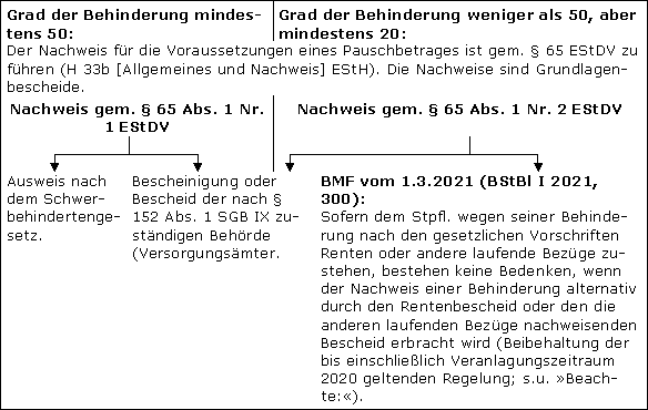 Zum Nachweis der Behinderung, bei einem Grad der Behinderung von weniger als 50, aber mindestens 20 s. § 65 Abs. 1 Nr. 2 EStDV sowie das BMF-Schreiben vom 1.3.2021 (BStBl I 2021, 300): Bei einer Behinderung, deren Grad auf mindestens 20, aber weniger als 50 festgestellt worden ist, gibt es jetzt – im Vorgriff auf eine gesetzliche Klarstellung – eine Erleichterung des BMF, was den Nachweis angeht. Sofern dem Stpfl. wegen seiner Behinderung nach den gesetzlichen Vorschriften eine Rente zusteht, bestehen keine Bedenken, wenn die Behinderung durch den Rentenbescheid nachgewiesen wird. Dies gilt entsprechend auch bei anderen laufenden Bezügen. Dies stellt eine Beibehaltung der bis einschließlich VZ 2020 geltenden Regelung dar.