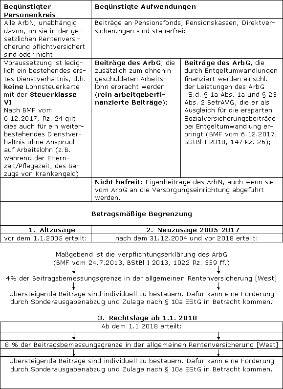 Heubeck u.a., Zur Besteuerung der betrieblichen Altersversorgung nach dem Alterseinkünftegesetz, DB 2007, 592; Kirschenmann, Betriebliche Altersversorgung – Steuerliche Änderungen im Bereich der umlagefinanzierten betrieblichen Altersversorgung, NWB Fach 6, 5011; Fischer, Steuerliche Förderung der privaten Altersvorsorge und betrieblichen Altersversorgung, DStR 2009, 722; Plenker, Betriebsrentenstärkungsgesetz – Ausblick auf 2018, BC 2017, 105; Plenker, Steuer- und sozialversicherungsrechtliche Besonderheiten bei der bAV aufgrund des Betriebsrentenstärkungsgesetzes, DB 2018, 81; Meissner, Das BMF-Schreiben zur Förderung der betrieblichen Altersversorgung, DStR 2018, 99. Veh, Betriebliche Altersversorgung im Durchführungsweg Direktversicherung – Abgrenzung von Alt- und Neuzusage, DStR 2020, 1101.