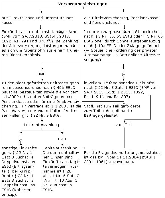 Die fünf Durchführungswege sind steuerlich zweizuteilen, siehe nachstehend Abschnitt 7. Direktzusage (synonym: Pensionszusage) und Unterstützungskasse haben für den ArbN während seiner aktiven Zeit steuerlich keine Auswirkung. Die Versorgungsleistungen sind als Versorgungsbezüge Einkünfte aus nichtselbstständiger Arbeit (§ 19 Abs. 2 EStG), LStR 19.8. Hingegen führen die übrigen Durchführungswege während der aktiven Zeit bereits zur Steuerpflicht (§ 19 Abs. 1 Satz 1 Nr. 3 EStG, § 2 Abs. 2 Nr. 3 LStDV) bei teilweiser Steuerfreiheit (§ 3 Nr. 56 und Nr. 63 EStG) und der Möglichkeit der Lohnsteuerpauschalierung bei Pensionskassen (§ 40b EStG) und übergangsweise bei Direktversicherungen (§ 52 Abs. 52b EStG), während die Versorgungsleistungen als sonstige Einkünfte nach § 22 Nr. 5 EStG zu versteuern sind.