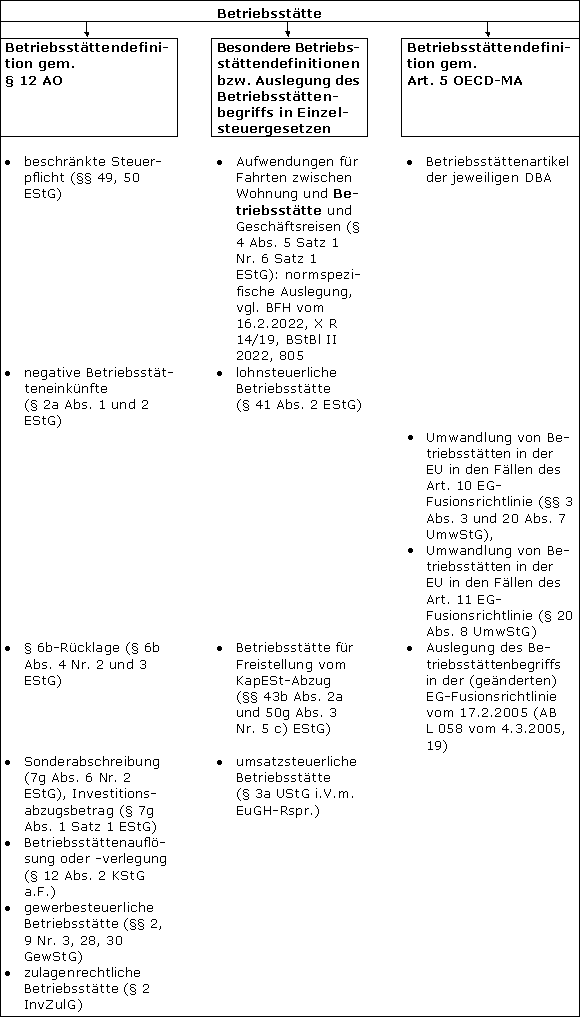 § 12 AO enthält eine grundlegende Definition des Betriebsstättenbegriffs für das inländische Steuerrecht und Art. 5 OECD-MA 2017 (Betriebsstättenartikel) für Zwecke des internationalen Steuerrechts. Auch wenn der Betriebsstättenartikel von dem deutschen Recht stark beeinflusst und in weiten Bereichen deckungsgleich ist, gibt es gewisse Unterschiede (dies ist rechtlich unbedenklich, weil kein Gebot der Inhaltsgleichheit vom innerstaatlichen und abkommensrechtlichen Begriff besteht). Bei der Auslegung des internationalen Betriebsstättenbegriffs kann demzufolge nicht generell auf § 12 AO zurückgegriffen werden; das Verständnis ist abkommensrechtlicher Natur (d.h. Auslegung unter Berücksichtigung der Einkunftsabgrenzung der Vertragsstaaten und ihrer finanziellen Interessen). Bestimmte Rechtsvorschriften der Einzelsteuergesetze enthalten eigene von § 12 AO abweichende Definitionen des Begriffs der Betriebsstätte. Dieser auf den bestimmten Regelungszweck der Norm abgestimmte Betriebsstättenbegriff geht der allgemeinen Definition in § 12 AO vor.