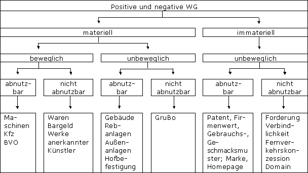 Zu unterscheiden ist zunächst einmal zwischen Vermögensgegenständen und Schulden (§ 240 Abs. 1 HGB, § 253 HGB; → Verbindlichkeit im Betriebsvermögen). Die WG selbst werden in unterschiedliche Arten unterteilt, da das EStG an diese Arten unterschiedliche Rechtsfolgen knüpft.