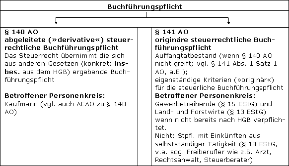 Die steuerliche Buchführungspflicht ergibt sich aus den §§ 140 und 141 AO. Wer nach anderen Gesetzen zur Buchführung verpflichtet ist, die für die Besteuerung von Bedeutung sind, muss auch gem. § 140 AO nach dem Steuerrecht Bücher führen. Da das Steuerrecht insoweit auf außersteuerliche Vorschriften zurückgreift, wird von der abgeleiteten oder derivativen Buchführungspflicht gesprochen. Ergibt sich eine Verpflichtung zur Führung von Büchern nicht aus § 140 AO, kann ggf. eine originäre Buchführungspflicht aus § 141 AO abgeleitet werden.
