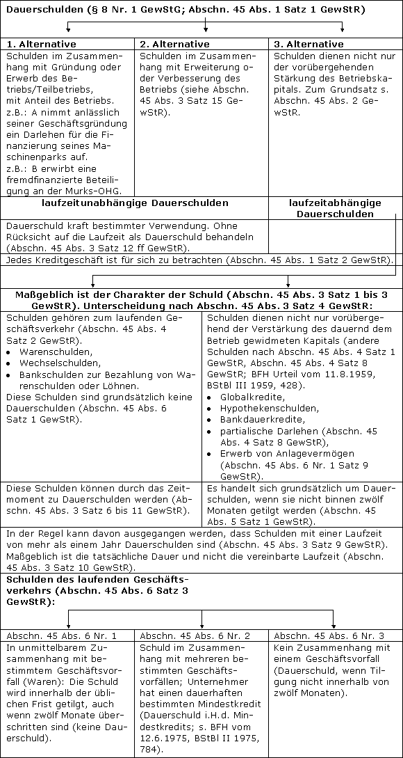 Nach § 8 Nr. 1 GewStG war dem gewerblichen Gewinn die Hälfte der bei seiner Ermittlung abgezogenen Entgelte für solche Schulden hinzuzurechnen, die wirtschaftlich mit der Gründung oder dem Erwerb des Betriebs (Teilbetrieb) oder mit einer Erweiterung oder Verbesserung des Betriebs zusammenhingen oder der nicht nur vorübergehenden Verstärkung des Betriebskapitals dienten (Abschn. 47 Abs. 1 GewStR). Die so abgegrenzten Schulden werden als Dauerschulden bezeichnet. Der Begriff der Dauerschulden wird in Abschn. 45 GewStR 1998 näher erläutert. Zum Begriff der Dauerschuldzinsen bei Kontokorrentkrediten s. z.B. auch BFH Urteil vom 15.9.2011, I R 51/10, BFH/NV 2012, 446.
