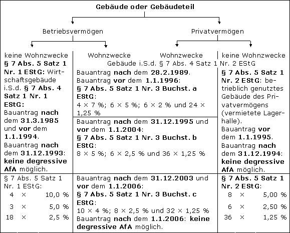 Bei Gebäuden bestimmt sich die degressive AfA nach § 7 Abs. 5 EStG. In Anspruch nehmen kann die degressive AfA