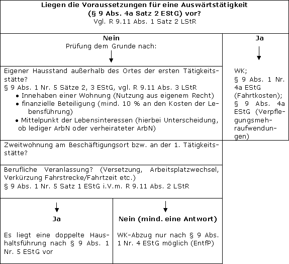 Übernachtungs- und Verpflegungsmehraufwendungen können auch bei Auswärtstätigkeiten im Rahmen der Reisekosten steuerlich geltend gemacht werden Da dafür aber hinsichtlich der Voraussetzungen und Rechtsfolgen andere Grundsätze gelten, sind beide voneinander zu trennen. Es ist stets zu prüfen, welche Art von Unterkunftskosten geltend gemacht wird. Es ist zunächst zu hinterfragen, ob die entstandenen Aufwendungen aufgrund einer beruflich veranlassten Auswärtstätigkeit erwachsen sind und demnach den Reisekosten zuzuordnen sind, da allgemein der Grundsatz gilt: Eine doppelte Haushaltsführung liegt nicht vor, solange die auswärtige Beschäftigung als Auswärtstätigkeit anzuerkennen ist; vgl. LStR 9.11 Abs. 1 Satz 2).