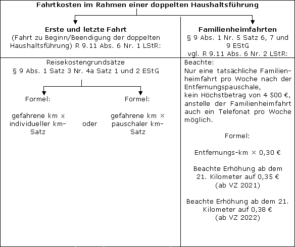 Erste und letzte Fahrt zur Begründung bzw. Beendigung der doppelten Haushaltsführung: Ansatz der tatsächlichen Kosten: Gefahrene km x Fahrten x pauschaler km-Satz/ individueller km-Satz Pauschaler km-Satz = 0,30 € bei Benutzung eines Pkw; bei anderen motorbetriebenen Fahrzeugen 0,20 € Familienheimfahrten: Ansatz der EntfP nach § 9 Abs. 1 Nr. 4 EStG: Entfernungs-km x Fahrten x 0,30 € Beachte: Erhöhung ab dem 21. km ab VZ 2021 auf 0,35 € Beachte: Ansatz nur eine Fahrt wöchentlich Wahlrecht zur EntfP (bei mehreren Heimfahrten wöchentlich) |