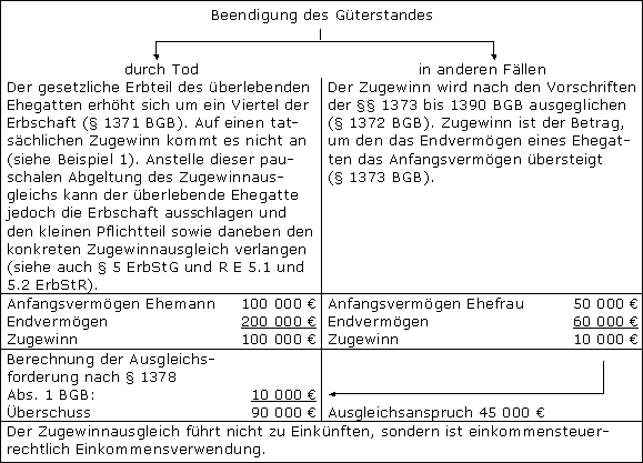 Im Rahmen der erbrechtlichen Lösung gem. § 1371 Abs. 1 BGB wird dagegen der Ausgleich des Zugewinns dadurch verwirklicht, dass sich der gesetzliche Erbteil des überlebenden Ehegatten um ein Viertel der Erbschaft erhöht. Hierbei ist es unerheblich, ob die Ehegatten im Einzelnen einen Zugewinn erzielt haben. Stirbt z.B. der Ehemann im obigen Beispiel und hinterlässt seine Ehefrau und zwei Kinder als gesetzliche Erben, erhöht sich der gesetzliche Erbteil der Ehefrau um 1/4 und beträgt somit bei zwei Kindern 1/2. Der gesetzliche Erbteil der Ehefrau beträgt nach §§ 1371 Abs. 1 und 1931 Abs. 1 BGB 1/2 aus 200 000 € = 100 000 €. Für erbschaftsteuerliche Zwecke ist jedoch fiktiv eine steuerfrei zu stellende Ausgleichsforderung zu ermitteln (§ 5 Abs. 1 Satz 1 ErbStG) und vom Erwerb des Ehegatten abzuziehen (R E 5.1 ErbStR). Der Zugewinn führt bei Beendigung der Ehe zu einem Ausgleichsanspruch, der, weil gesetzlich begründet, nicht als Erwerb i.S.d. Erbschaftsteuerrechts angesehen werden kann.