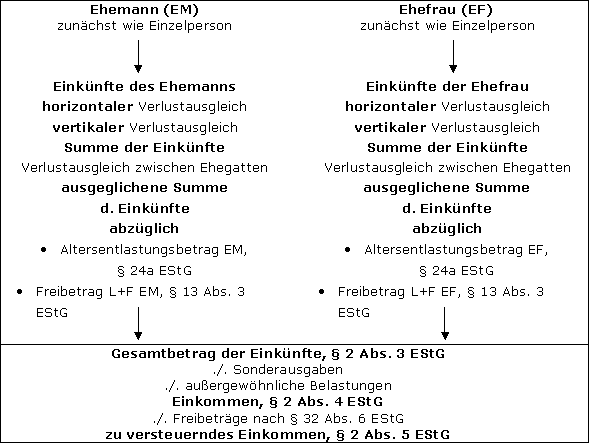 Aufgrund des progressiven Steuertarifs führt die Zusammenveranlagung bei Ehegatten mit unterschiedlich hohen Einkünften i.d.R. zu einer niedrigeren ESt als die Einzelveranlagung. Bei Zusammenveranlagung erfolgt die Ermittlung des zu versteuernden Einkommens nach folgendem Schema: